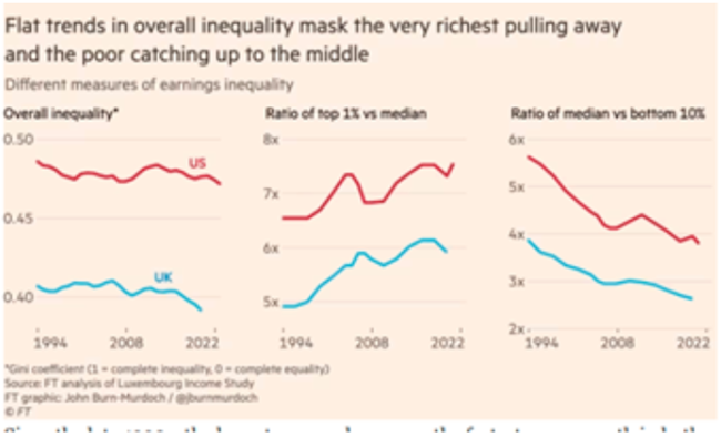 영국에서는 최저임금의 지속적인 인상이 이러한 변화의 중요한 요인으로 작용했다또한 미국과 영국 모두에서 저숙련 노동자는 직업 분포의 중간층이 '공동화'되면서 혜택을 보았고중간 숙련 노동자는 피해를 입었다미국에서는 최고 소득 직업이 점점 소수의 초고위직 직군에 집중되고 있다기술직 노동자는 현재 상위 5% 급여 계층의 6분의 1을 차지하고 있으며이는 1990년의 20분의 1에서 증가한 수치다과거에는 어떤 단일 집단도 이런 정도의 지배력을 갖지 못했다.