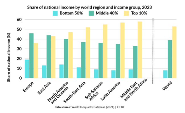 다음으로 글로벌 소득 불평등이 있다이는 가난한 나라와 부유한 나라의 성인 소득 격차그리고 각국 평균 소득 간 격차를 의미한다. 2023년 전 세계 1인당 평균 국가 소득(공공 서비스의 '현물가치를 포함)은 연간 약 12,800유로(PPP 기준), 월 1,065유로로 나타났다하지만 이 수치는 지역 간의 엄청난 격차를 숨기고 있다예를 들어사하라 이남 아프리카의 평균 소득은 월 240유로에 불과하지만북미와 오세아니아에서는 월 3,500유로를 초과해 지역 간 격차가 1대 15에 달한다.