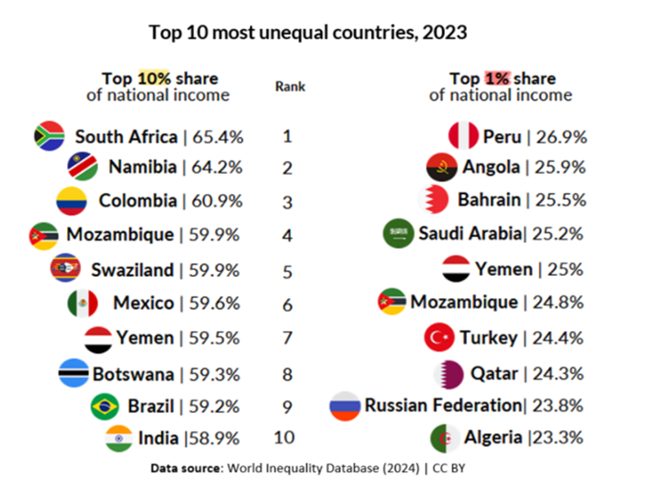 일부 국가에서는 불평등이 극단적인 수준에 도달했다예를 들어남아프리카공화국은 가장 불평등한 국가 중 하나로상위 10%가 국가 소득의 65%를 차지하고 있다예멘 또한 심각한 불평등을 보이며상위 10%가 소득의 59.5%를 차지하고상위 1%만으로도 25%를 가져가고 있다.