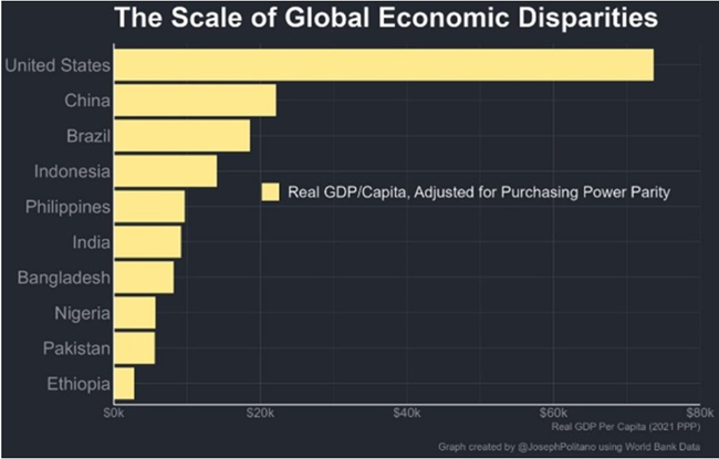 미국의 연간 1인당 생산량은 7만 3천 달러로저소득 국가 평균의 약 26배에 달한다심지어 인도나이지리아필리핀과 같은 하위 중소득 국가들도 미국 경제 생산량의 9분의 1에 불과하다낮은 GDP는 식량의료기술 소비의 감소를 의미하며인프라교육주택에 대한 투자 부족과 전 세계 수십억 명의 사람들에게 영향을 미치는 전반적인 복지 감소로 이어진다.