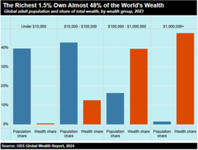 국가 간 그리고 국가 내 소득 불평등은 부의 불평등에 비하면 상대적으로 미미하다앞서 언급한 바와 같이최신 UBS 글로벌 부 보고서에 따르면 전 세계 개인 부의 상위 1.5%가 전체 개인 부의 약 48%를 차지하고 있으며세계 인구의 하위 40%는 부채를 제외하면 아무런 자산도 소유하지 못하고 있다.