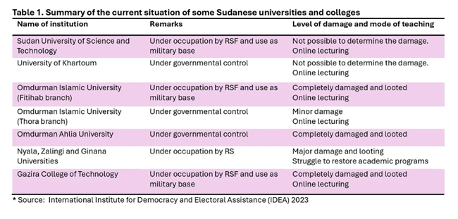 2019년 이후, 수단 대학들은 정치적 불안정과 COVID-19 팬데믹으로 인해 학문적 무질서를 경험해왔다. 그럼에도 이러한 상황은 대학들이 전자 학습 시스템을 도입하도록 하는 계기가 되었다. 그 결과, 전쟁이 시작되었을 때 대학들은 이미 이 분야에서 일정한 전문성을 갖추고 있었으며, 대부분의 대학들은 전자 학습 플랫폼을 구축했다. 전쟁이 진행되는 현실 속에서, 대학 행정 당국은 기존의 전자 학습 시스템을 활용하여 학부 과정의 지속에 집중하고 있다. 대학들은 일부 문제들에 대한 해결책을 마련하는 데 성공했으며, 많은 대학들이 온라인, 안전한 지역, 혹은 해외에서 학술 프로그램을 개설하기 시작했다. 일부 수단 대학들은 이미 몇몇 강의(특히 의과대학 고학년 과정)를 다른 국가로 이전했으며, 이는 비용이 매우 큰 대안이다. 더욱이, 다수의 대학들이 비교적 안전한 지역에 있는 자매 대학들과 양해각서를 체결했다. 이러한 조치는 많은 대학들이 교육과정의 실습 부분을 이수하는 데 기여했다. 또한, 일부 수단 대학들은 해외에 지부를 설립하기도 했다.