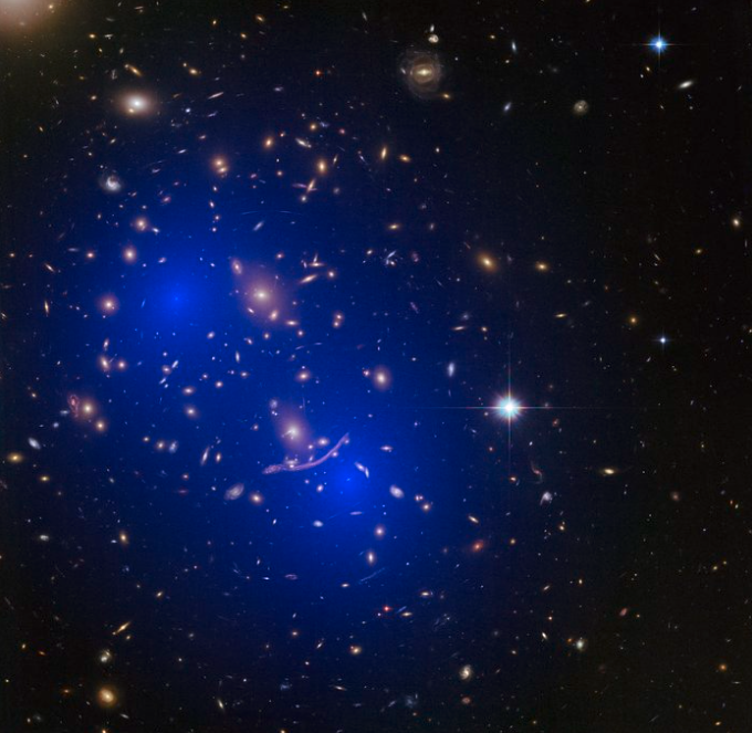 이미지에서 파란색으로 표시된 부분은 은하단 내에 존재하는 암흑물질의 분포를 나타낸 것이다. 출처: NASA, ESA, D. Harvey(스위스 로잔연방공과대학교), R. Massey(영국 더럼대학교), 허블 SM4 ERO 팀 및 ST-ECF, CC BY