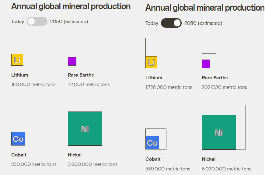 데이터셋 간의 불일치로 인해이 시리즈에는 여러 출처의 데이터를 사용했다리튬코발트니켈의 현재 생산량 데이터는 미국지질조사국(USGS)의 2024년 광물 상품 요약 보고서(Mineral Commodity Summaries 2024)에서 가져왔다. 2050년까지의 모든 전망치는 국제에너지기구(IEA)의 2024년 글로벌 핵심 광물 전망(Global Critical Minerals Outlook)에서 인용했다이 보고서는 청정 에너지에 사용되는 자성 희토류 원소 네 가지(네오디뮴프라세오디뮴디스프로슘터븀)에 대한 데이터만 포함하고 있다따라서 희토류 원소의 현재 생산량 데이터는 IEA에서 가져왔으며이 또한 해당 네 가지 자성 희토류 원소에 한정된다.