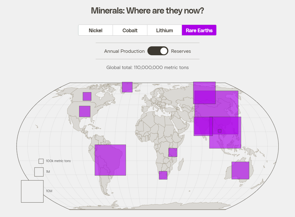 전기 모터에 필수적인 구성 요소인 자성 희토류 원소에는 네오디뮴(Neodymium), 프라세오디뮴(Praseodymium), 디스프로슘(Dysprosium), 터븀(Terbium) 등이 포함된다.(원문 그래픽을 방문하여 아래의 금색 원에 커서를 올리면어떤 광물들이 현대 사회를 움직이고 있는지 확인할 수 있다.)