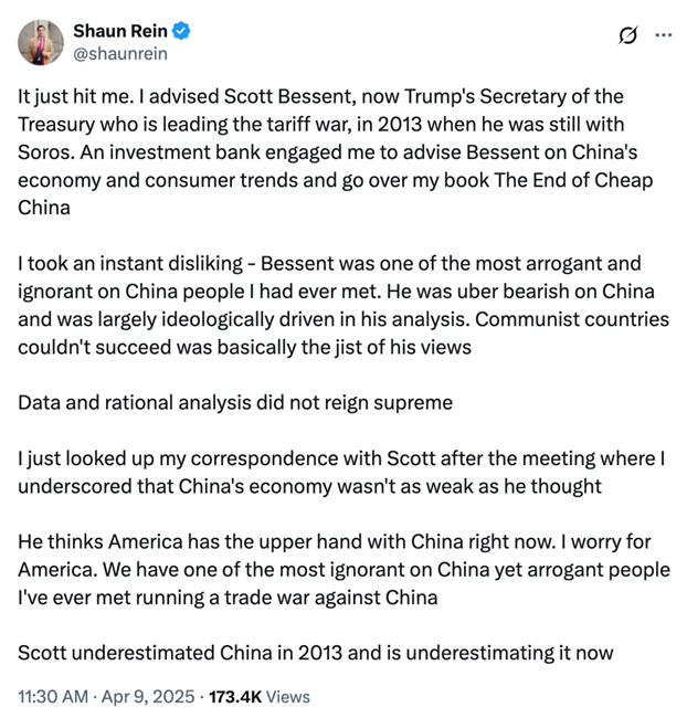 갑자기 생각났다나는 지금 트럼프의 재무장관이며 관세 전쟁을 이끌고 있는 스콧 베센트(Scott Bessent)에게 2013년에 조언한 적이 있다그때 그는 아직 소로스(Soros) 밑에 있었다한 투자은행이 나에게 의뢰해서베센트에게 중국 경제와 소비자 트렌드에 대해 조언하고 내 책 ⟪The End of Cheap China⟫에 대해 설명해주도록 했다.