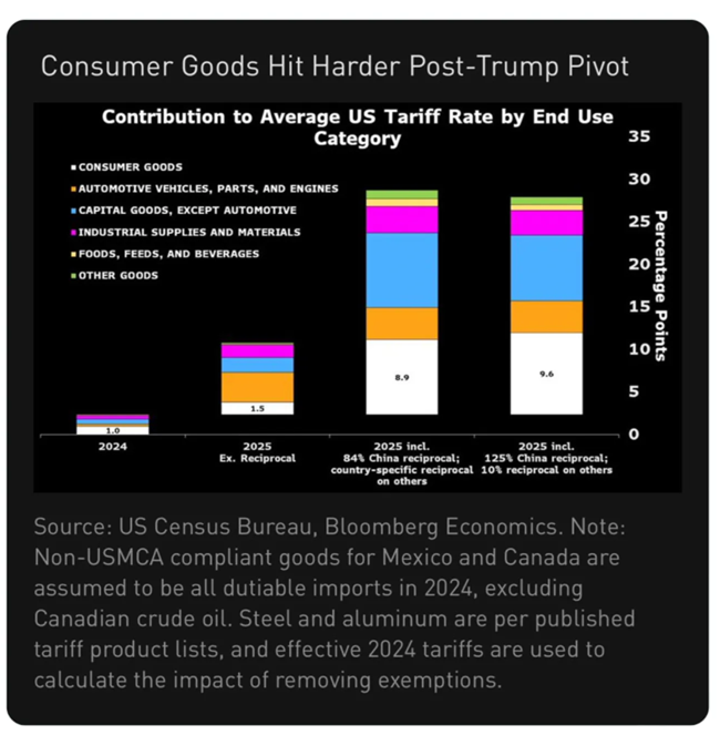 우리는 오늘 트럼프의 푸트 옵션(위기가 생길 때마다 개입하거나 뭔가를 양보하는 경향)” 발표 이후를 계산해봤다결과적으로 현재의 관세 구성은 더 악화되었다중국은 미국에 소비재를 수출하는 최대국이기 때문에다른 나라들에 비해 중국에 부과된 관세 비율이 급등하면소비재에 미치는 타격 역시 더욱 커지게 된다.