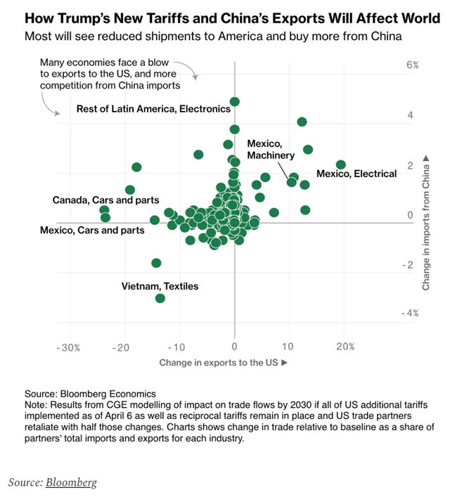 이 그래프는 4월 6일 기준 미국이 추가 관세를 전면 시행하고상호 관세 조치가 그대로 유지되며미국의 교역 상대국들이 이에 절반 정도 수준으로 보복하는 경우를 가정하여 2030년까지의 무역 흐름에 미치는 영향을 CGE 모델링을 통해 분석한 결과를 보여준다.