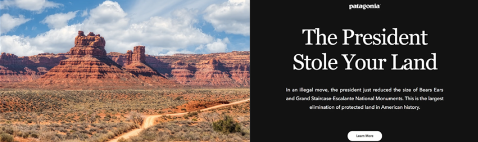 다소 충격적인 이 메시지는 당시 트럼프 행정부가 국립기념지 축소공공 토지 민영화환경 규제 완화를 시도하던 시기와 맞물려 나왔다파타고니아는 웹사이트 첫 화면에 대통령이 당신의 땅을 훔쳤습니다라는 문구를 내걸었고동종 업계 기업들과 함께 베어스 이어스 국립기념지 축소를 막기 위해 직접 소송을 제기하기도 했다.