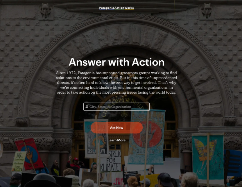 파타고니아는 단순히 문제를 경고하는 것을 넘어서사람들이 행동할 수 있도록 구체적인 경로를 안내한다예를 들어자사 플랫폼인 Action Works에서는 지역 기반 풀뿌리 단체를 소개하고사용자가 직접 참여할 수 있도록 돕는다.