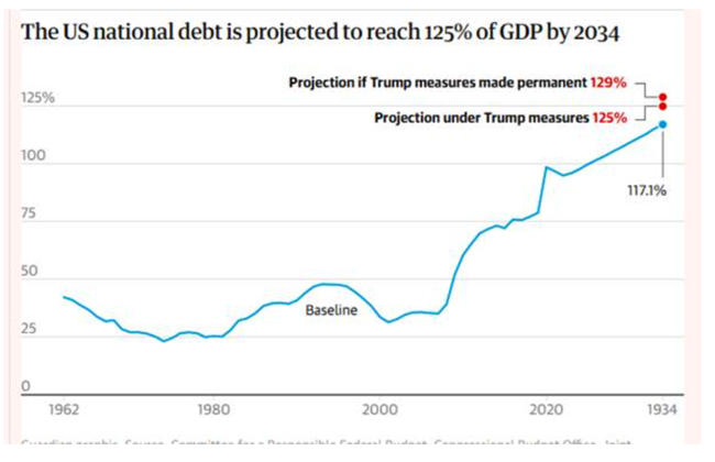 하지만 이것이 미국 지배 엘리트를 걱정하게 만드는 요인은 아니다. 그들에게 있어 아름답지 않고 추악한 것은 불평등의 심화가 아니라, 이 예산안이 실행될 경우 나타날 정부 예산 적자와 공공 부채의 급격한 증가다. 초당적 기구인 ‘연방예산책임위원회’는 트럼프의 예산이 2034년 말까지 공공 부채를 최소 3조 3천억 달러 증가시킬 것으로 추산했다. 이 예산안은 정부 부채 대비 국내총생산(GDP) 비율을 현재의 100%에서 사상 최고치인 125%로 증가시킬 것이다. 이는 현재 법률 하에서 2034년까지 예상되는 117% 상승보다 높은 수치다. 한편, 연간 재정 적자는 2024년의 약 6.4%에서 6.9%로 증가할 전망이다.