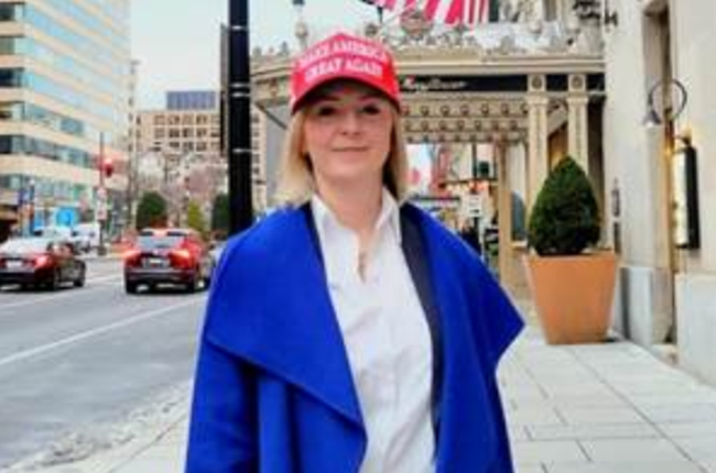 리즈 트러스는 트럼프 취임식 때 착용한 MAGA 모자를 쓰고 있었다.