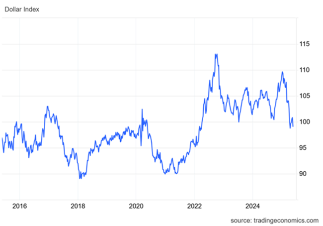 그럼에도 ‘리즈 트러스 순간‘은 미국에서는 일어나지 않을 것이다. 영국도 미국처럼 무역수지와 예산수지 모두 적자를 기록하고 있지만, 영국은 훨씬 더 외국인의 ‘친절’에 의존하고 있다고 현 캐나다 총리이자 전 영국은행 총재인 마크 카니(Mark Carney)가 말한 바 있다. 다시 말해, 이러한 적자들은 외국인 투자를 통해 충당되어야 하며, 이는 영국 산업에 대한 직접 투자든, 영국의 채권이나 통화에 대한 투자든 마찬가지다. 그러나 그 ‘친절’은 트러스 집권 하에서 하룻밤 사이에 사라졌다. 하지만 트럼프 하의 미국에서는 그런 일이 벌어지지 않을 것이다. 미국 달러는 세계의 기축통화이자 주요 무역 및 투자 통화이며, 앞으로도 그렇게 남을 것이기 때문이다. 물론 트럼프의 관세 전쟁과 예산안 발표 이후 최근 몇 달 동안 달러 가치는 하락했다. 하지만 역사적으로 볼 때 여전히 상대적으로 높은 수준에 머물러 있다.
