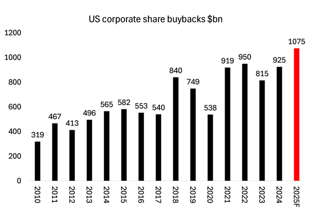 게다가, 지난 1년간 이윤을 올린 기업들은 새로운 생산설비(capacity)에 재투자하지 않고, 대신 자사 주식을 사들이며 주가를 끌어올리고 있다. 지난 3개월 동안 그 규모는 5,000억 달러에 달한다.
