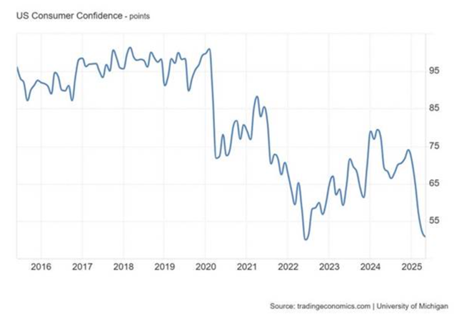 미국 가계 역시 MAGA 고문들이나 투자은행 경제학자들만큼 경제에 대해 자신감을 갖고 있지 않다. 소비자 신뢰 지수는 사상 두 번째로 낮은 수준까지 떨어졌다.