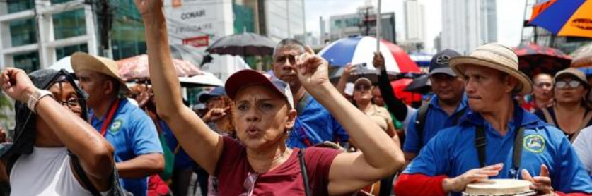 2025년 5월 20일, 파나마시티에서 무기한 파업이 진행 중인 가운데 노동자들이 호세 라울 물리노 대통령 정부에 반대하는 시위에 참여하고 있다. 출처: 마르틴 베르네트