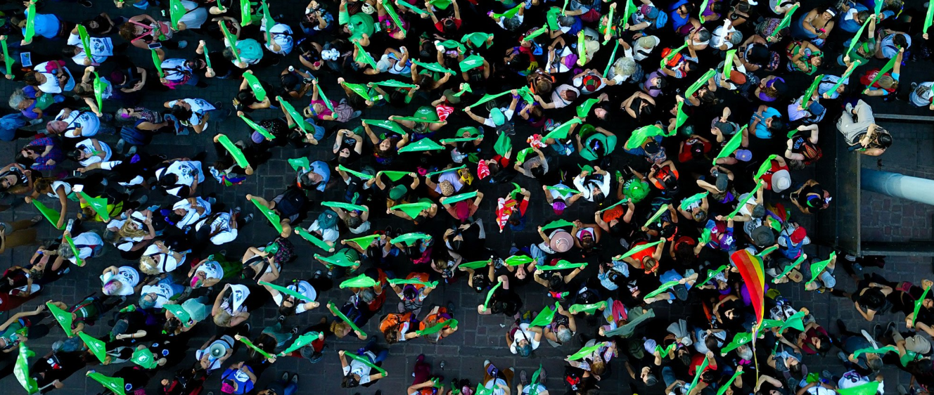 시위대가 2024년 10월 12일, 아르헨티나 후후이에서 열린 제37차 플루리나시오날 여성·레즈비언·트라베스티·트랜스·양성애자·인터섹스·논바이너리인 회의에서 ‘합법적이고 안전하며 무료인 낙태권을 위한 전국 캠페인’의 일환으로 손수건을 높이 들고 있다. 출처: Susi Maresca