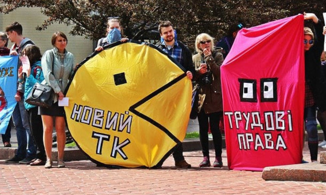 왼쪽 팻말에는 “개정 노동법전”이라고 적혀 있고, 오른쪽 팻말에는 “노동자 권리”라고 적혀 있다. 출처: 소찰니 루흐(Sotsialnyi Rukh)