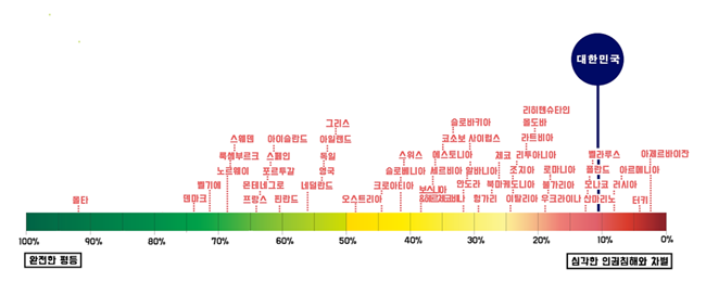 10.56%. 러시아(46위)와 벨라루스(45위) 사이의 최하위권. 이는 SOGI법정책연구회의 “한국 LGBTI 인권현황 2020/2021”에서, “ILGA-Europe Rainbow Map” 기준에 따라 한국의 성소수자 관련 제도를 분석해 계량화한 <무지개 지수>다. 러시아와 벨라루스는 소련 붕괴 이후 자본주의화 속에서 사회가 해체되고 극우화된 대표적인 성소수자 박해 국가들이다. 그리고 한국은 지금 그들과 어깨를 나란히 하고 있다.