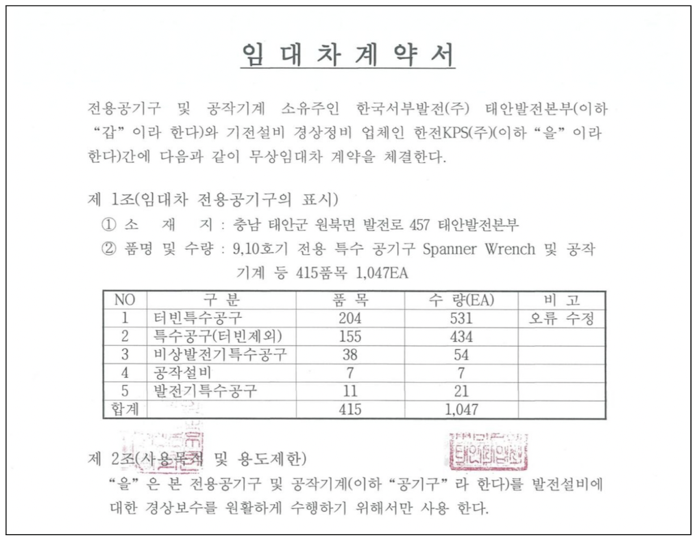 한국서부발전과 한전KPS가 2024년 12월 체결한 '태안9・10호기 기전설비 경상정비공사 전용공기구(공작기계) 임대차 계약서'. 안호영 의원실 제공