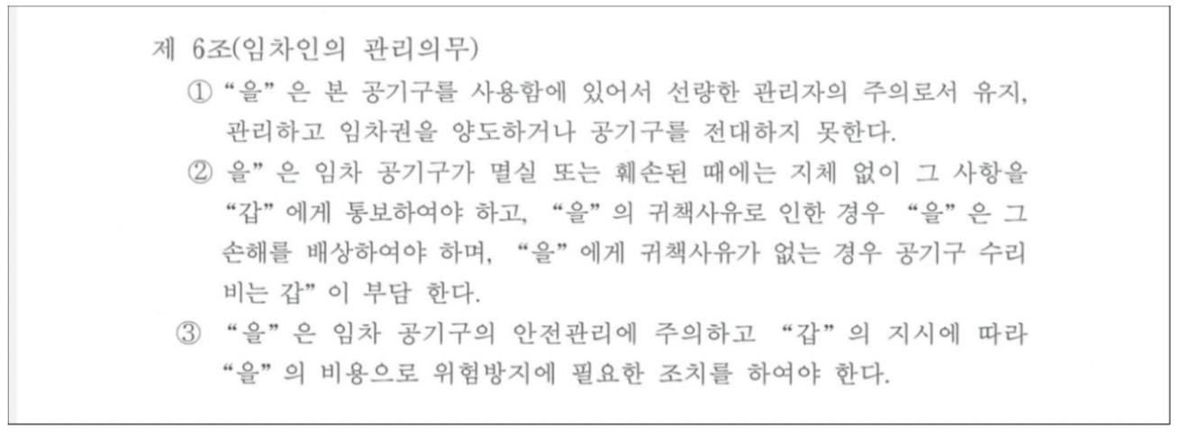 또한 계약서의 같은 조 3항에는 "'을'은 임차 공기구의 안전관리에 주의하고 '갑'의 지시에 따라 '을'의 비용으로 위험방지에 필요한 조치를 하여야 한다"고 쓰여있다.