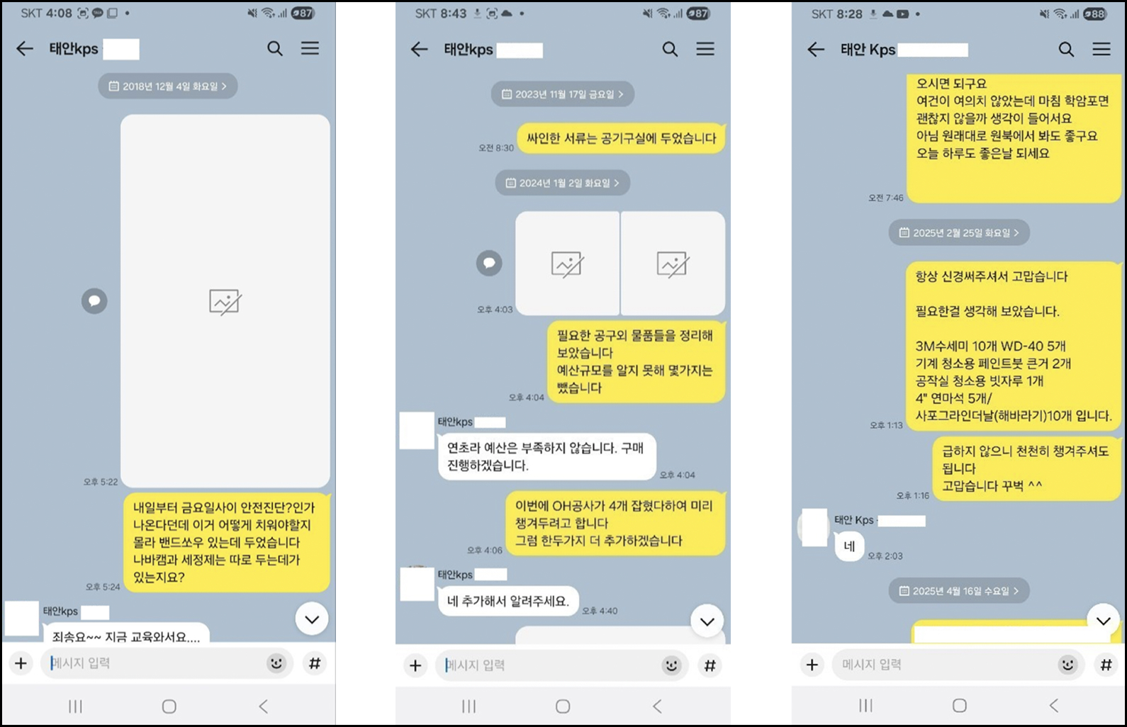 예컨대 지난 2017년 11월, 한전KPS 관리자는 아래와 같은 카카오톡 메시지로 고인에게 ' '긴급 스페이서 가공 작업'을 직접 지시했다.