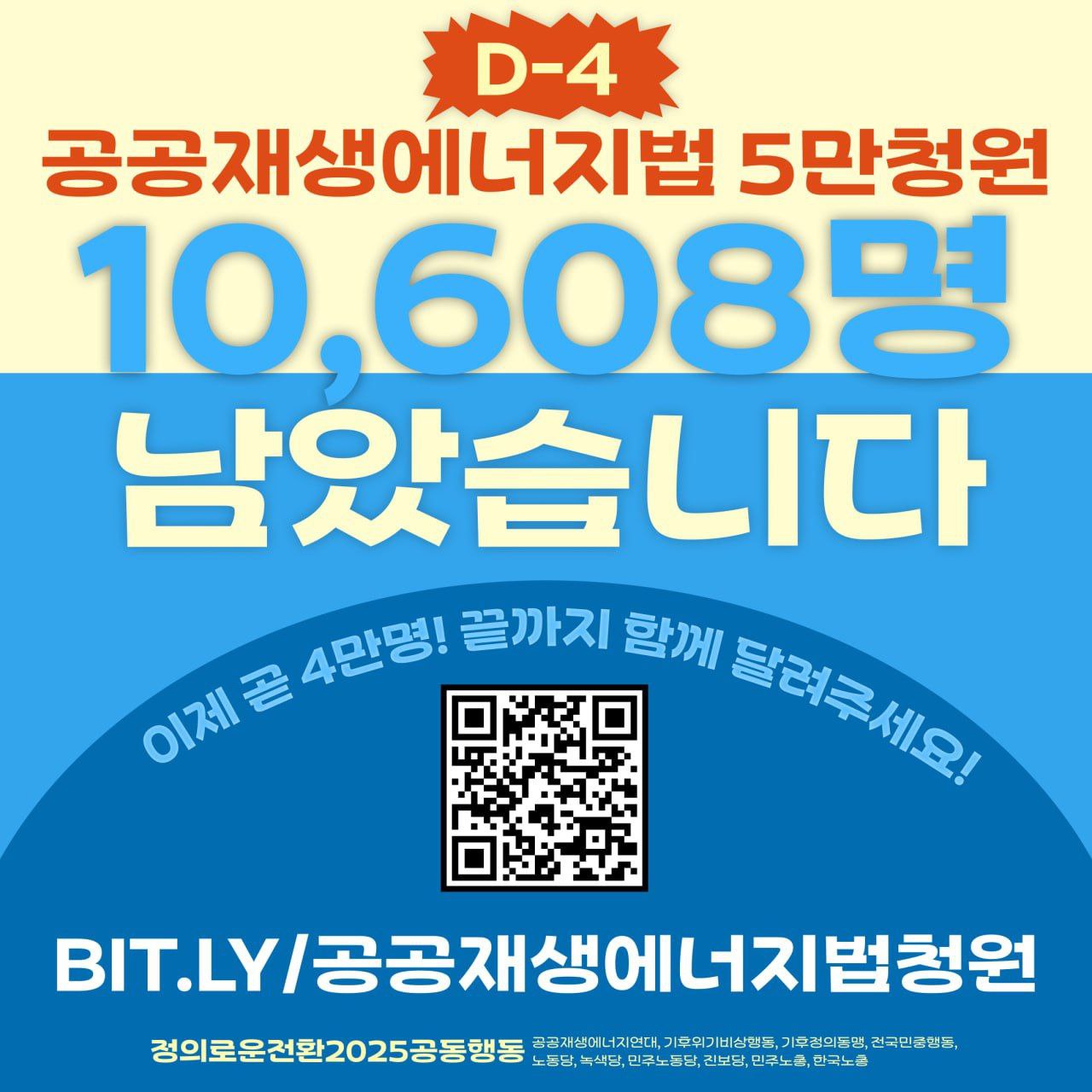 이 같은 고 김충현과 김용균의 동료들의 절실한 요구를 담아, 지난 6월 27일부터 공공재생에너지법 입법을 위한 5만 청원이 진행 중이다. 청원에는 23일 오후 2시 기준, 약 4만 명 이상이 참여한 상황이다. 마감일인 27일까지 남은 기간은 단 4일, 1만 명이 청원이 더 필요하다.