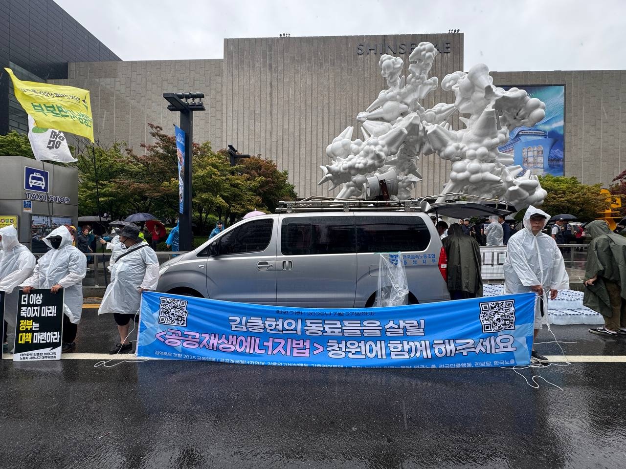 "김충현의 동료들을 살릴 <공공재생에너지법> 청원에 함께해 주세요"라는 현수막을 들고 있는 발전 비정규직 노동자들. 공공운수노조 세종충남본부 제공