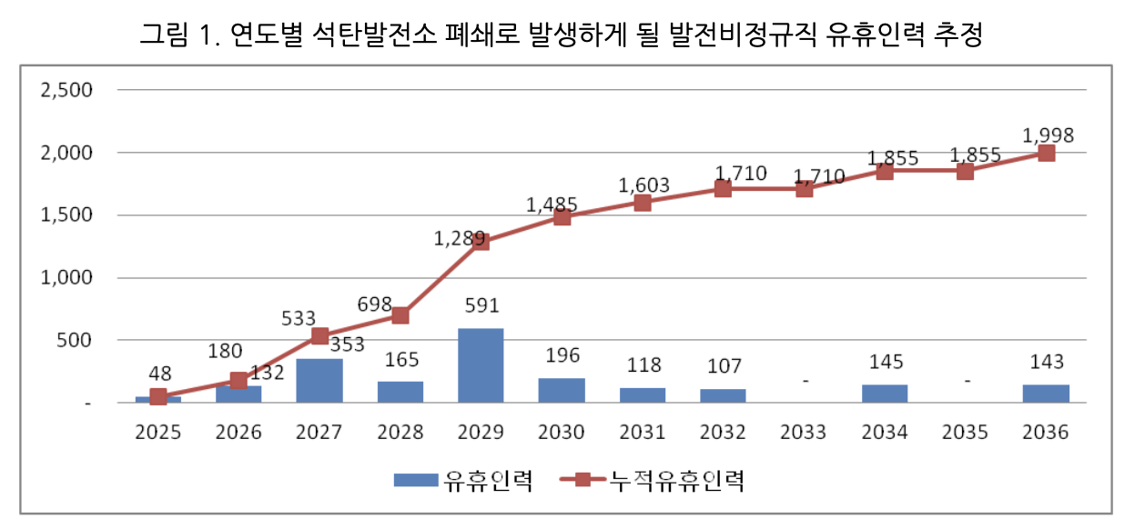 당장 올해 12월 태안화력 1호기 폐쇄로 발전 비정규직 중 48명이 유휴인력이 되고, 다수의 발전소 폐쇄가 예정된 2027년과 2029년에는 각각 353명과 591명의 유휴인력이 추가로 발생할 것으로 예측된다. 연쇄적 폐쇄로 누적 유휴인력은 꾸준히 늘어나 2036년에는 1,998명(자회사 유휴인력 48명 제외)에 이를 것으로 추정된다.