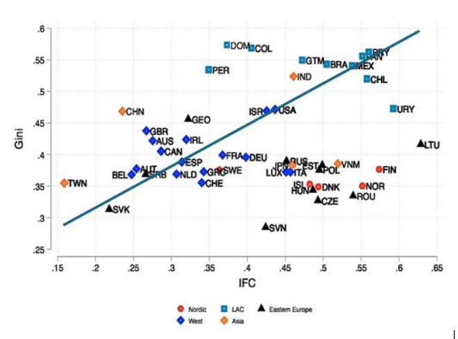 다음으로 왼쪽 위 모서리를 보자. 그곳에는 아무 나라도 없다. 라날디는 다른 논문에서 이를 중요한 “비결과(non-result)”라고 부른다. 이론적으로는 구성적으로 평등한 국가가 높은 소득 불평등을 가질 수 있다. 내 단순한 예시에서 지니계수는 46이었는데, 상위 인물의 노동소득을 100만 달러, 자본소득을 50만 달러로, 두 번째 인물의 노동소득을 10만 달러, 자본소득을 5만 달러로, 세 번째 인물의 노동소득을 2달러, 자본소득을 1달러로 설정하면 된다. 이렇게 해도 라날디의 IFC 지수는 0이지만, 지니계수는 무려 61로 치솟는다.