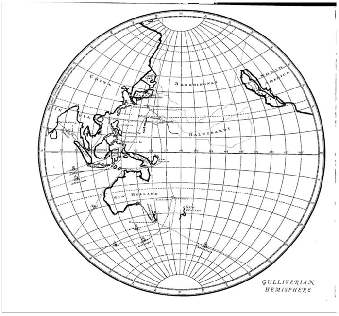 아서 E. 케이스(1945), ⟪걸리버 여행기의 지리와 연대기⟫(The Geography and Chronology of Gulliver's Travels). ⟪걸리버 여행기에 관한 네 편의 에세이⟫(Four Essays on Gulliver's Travels). 프린스턴: 프린스턴 대학교 출판부.