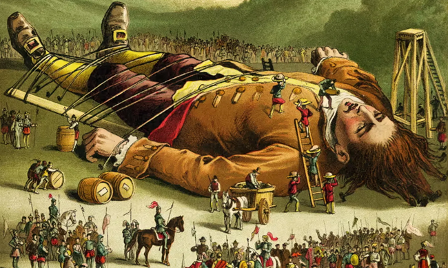 스위프트에 대한 복잡한 주해는 제쳐두고, 이 트루스소셜판 18세기 풍자를 보자. 여기서 미국은 잠들어버린 거인이다. 자기 이익만 챙기고 자만하는 자유주의 엘리트들에 의해 잠들어버린 거인 말이다. 잠든 동안, 이 거인은 작은 나라들의 책략의 대상이 되었다. 트럼프의 임무는 한때 위대했던 나라를 잠에서 깨우는 것이다. 세상을 파괴하거나 작은 나라들을 몰살하는 것이 아니라, 올바른 균형을 회복하는 것이다.