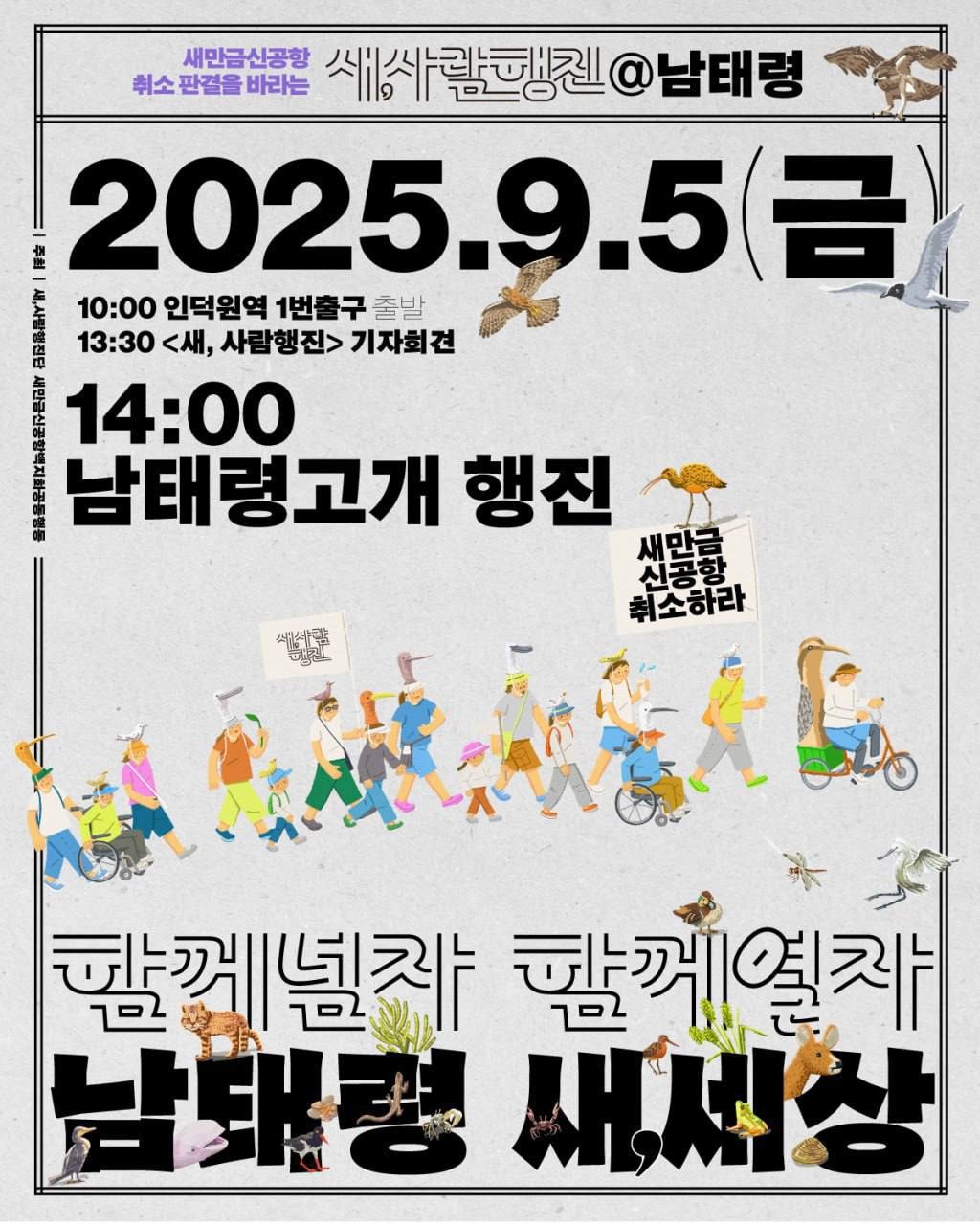 그래서 <새, 사람 행진단>은 행진을 하면서 만나는 사람들에게 새만금신공항뿐만 아니라, 다른 신공항 건설계획들도 전면 백지화되어야 한다고 말하고 있다. 인간들의 무지와 탐욕으로 기후재난을 가속하는 생태환경에 대한 침탈과 훼손을 멈춰 세우고, 인간과 자연이 깊이 연결된 존재로 서로를 돌보며 살아가는 것을 기후재난 시대에 새로운 규범이 되어야 한다고도 외친다.
