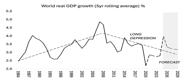 만약 회복력이라는 말이 단순히 금융위기를 피한 것을 넘어서는 의미라면주요 경제들이 실제로 회복력이 있다고 보기는 어렵다. 2021년 이후 실질 GDP 성장률은 매우 초라하다미국 경제는 연평균 약 2% 성장에 그치고 있으며이는 2010년대 장기 불황 시기보다도 낮은 수준이다그러나 다른 G7 국가들은 상황이 더 나쁘다이들 대부분은 연평균 1%도 안 되는 성장률로 정체 상태에 머물러 있다인도중국일본을 제외한 동아시아 등 빠르게 성장하는 국가들을 포함해도세계 경제 성장률 자체가 하락하고 있다.