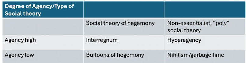 과도기(Interregnum): 기존 질서가 붕괴하고 새로운 질서가 아직 등장하지 않은 과도기 /초과행위성(Hyperagency): 통제 불가능한 과도한 행위성, 모든 것이 특정 행위자에게 집중되는 상태/허무주의, 쓰레기 시간(garbage time): 의미 없는 시간, 질서나 구조가 무너진 상태(스포츠에서 유래된 용어)
