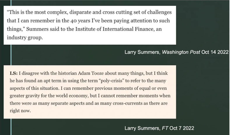 LS: “나는 역사학자 애덤 투즈(Adam Tooze)와 많은 점에서 의견이 다르지만, 이번 상황을 설명하기 위해 ‘폴리크라이시스(polycrisis)’라는 용어를 쓴 것은 적절했다고 생각한다. 나는 세계 경제에 있어 이와 비슷하거나 심지어 더 중대한 시기들도 기억하고 있다. 하지만 지금처럼 서로 분리된 여러 측면들과 교차하는 흐름들이 이토록 많은 순간은 기억할 수 없다.” — 래리 서머스(Larry Summers), 파이낸셜 타임스 2022년 10월 7일