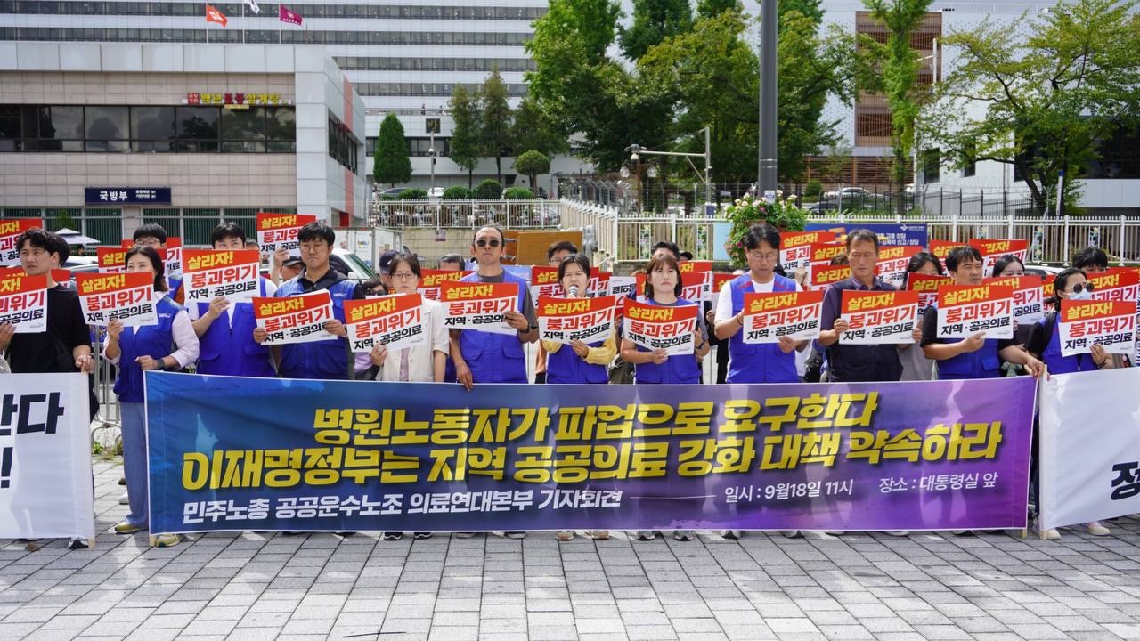 의료연대본부는 18일 오전 11시 서울 용산 대통령실 앞에서 기자회견을 열어 이재명 정부에 지역 공공의료 강화를 위한 실질적 대책 수립을 약속하라 촉구하고, 정부가 이같은 병원 현장 노동자의 요구를 수렴하지 않는다면 오는 24일 더 너르고 강력한 2차 공동파업에 돌입하겠다고 경고했다.