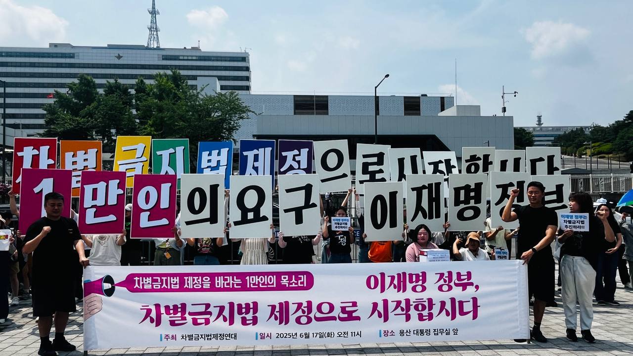 2025년 6월 17일, 서울 용산 대통령 집무실 앞에서 열린 기자회견에서 참가자들이 ‘1만 인의 요구, 이재명 정부 차별금지법 제정으로 시작합시다’라는 피켓을 들고 정부에 입법을 촉구하고 있다. 차별금지법제정연대 제공