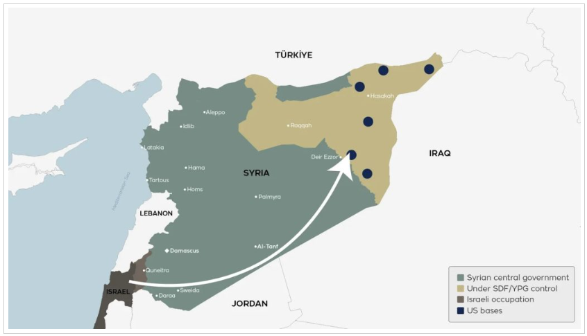 튀르키예가 시리아 국가 체제를 붕괴시키는 데 일조한 이후미국-이스라엘 축은 앙카라가 쿠르드 주도 시리아민주군(SDF)의 지위 문제를 해결할 수 있는 역량에 제한을 걸었다.