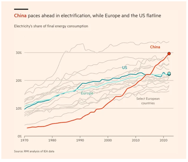 유럽과 미국에서는 최종 에너지 소비에서 전기가 차지하는 비중이 22%에 머물러 있으며, 탈탄소화를 둘러싼 온갖 호들갑에도 불구하고 10년 넘게 변하지 않고 있다. 반면 중국에서는 전기의 비중이 30%까지 올라갔고, 그 궤적은 가파르게 상승하고 있다(참고로 상위 이례치는 일본이다). 전기는 저배출 방식으로 생산할 수 있음을 알기 때문에, 전기화는 에너지 시스템을 정화하는 관문이다.