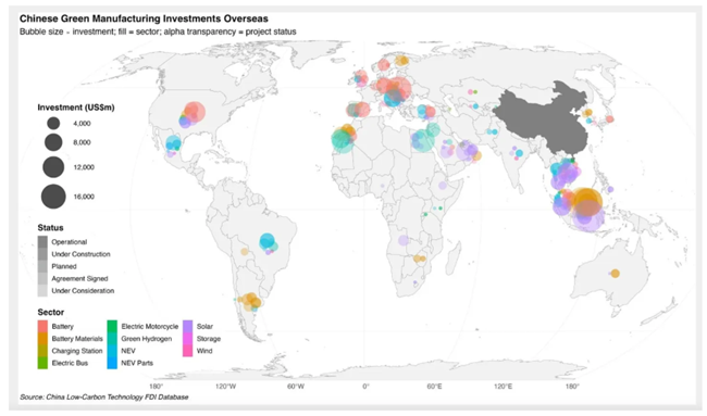 그리고 중국은 단순히 태양광 패널만 수출하는 것이 아니라, 2022년부터는 제조업 분야에서 대규모 해외 직접 투자(FDI)에도 나서고 있다. 존스홉킨스대학 넷제로정책랩(Net Zero Policy Lab)과 보스턴대학교 글로벌개발정책센터(Global Development Policy Center)의 동료들은 중국의 해외 녹색 제조업 투자를 다룬 주목할 만한 데이터베이스를 구축했다. 나는 이 수치들을 다시 다룰 예정인데, 이는 태양광을 넘어선 영역까지 포함한다. 그러나 이는 녹색 에너지 제조 역량이 확산고 있다는 반가운 신호다.