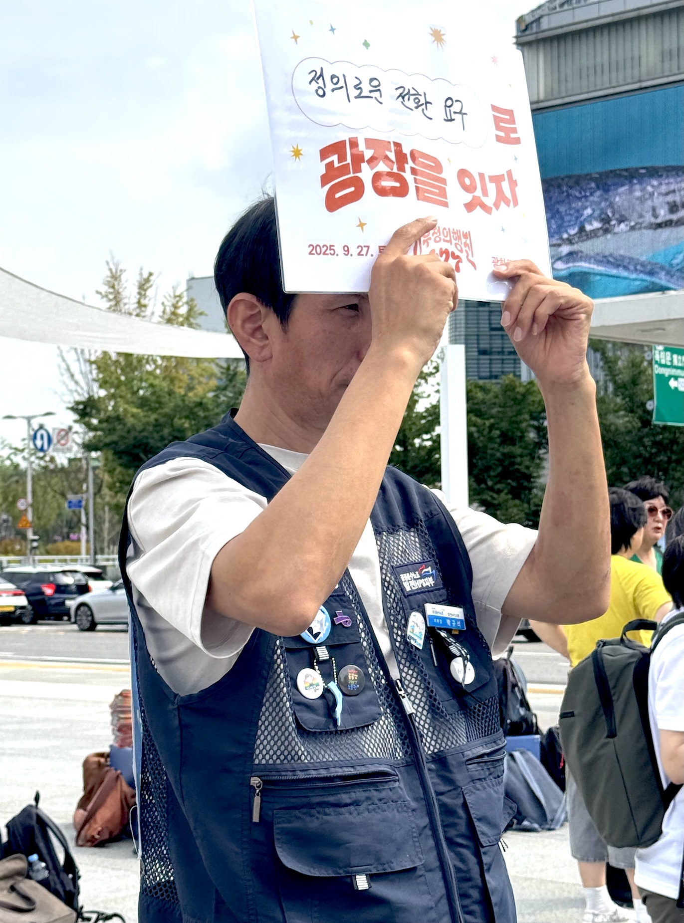 927 기후정의행진 선포식(8월 28일)에서 "정의로운 전환"을 요구하는 피켓을 든 발전 비정규직 노동자. 참세상