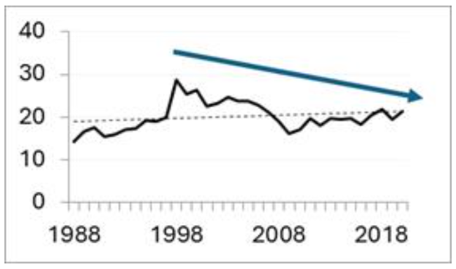 튀르키예 제조업이윤율은 전반적으로 약한 상승세를 보였으나, 1998년 이후로는 하락세였다.