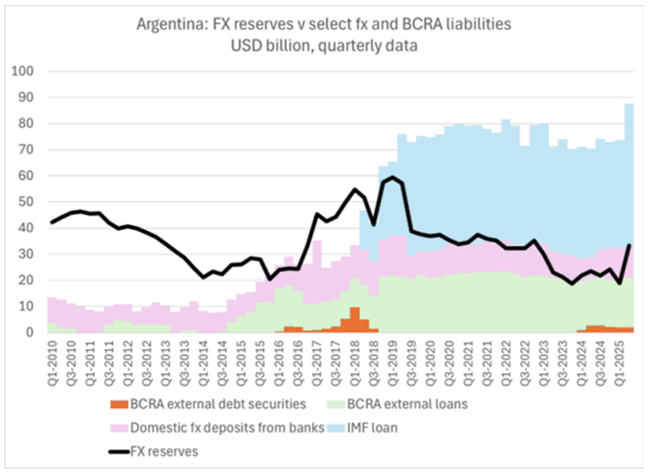IMF가 그 이후 막대한 대출을 제공했음에도 아르헨티나의 외환보유액은 현재 2018년보다 더 낮다. 당시 마우리시오 마크리(Mauricio Macri) 전 대통령은 500억 달러를 빌렸는데, 이는 IMF 역사상 최대 규모의 구제금융이었다. 그러나 그의 정치적 몰락으로 IMF 프로그램이 궤도에서 벗어나고 통화가 타격을 입었다. 이제 IMF의 대출과 중국과의 통화스와프 같은 부채를 감안하더라도, 올해 아르헨티나의 외환보유액은 여전히 크게 마이너스 상태를 유지하고 있다. 이는 IMF가 새로운 200억 달러 구제금융의 절반 이상을 선지급했음에도 그렇다.