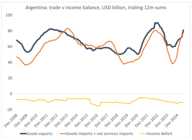 밀레이가 정부 예산의 균형을 만들었을지 몰라도, 그의 ‘재정 전기톱(fiscal chainsaw)’은 무역수지의 지속적인 취약성을 해결하지 못했다. 밀레이 집권 이후 수출이 약간 늘었지만 수입도 함께 증가했고, 수출로 벌어들인 소득은 해외로 빠져나갔다. 그 결과 경상수지의 월간 소득 적자가 확대됐다.