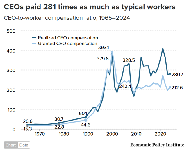 데이터에 따르면, 오늘날 CEO는 1990년대 중반보다 훨씬 더 많은 보수를 받고 있으며, 1960~70년대와 비교하면 수십 배 더 높은 수준이다. 실제로 CEO의 실현 보수는 1978년보다 1,094% 증가했다. 같은 기간 동안 일반 노동자의 임금은 26% 증가에 그쳤다. 그 결과, CEO와 일반 노동자 간 보수 비율은 1978년 31대 1에서 2024년 281대 1로 거의 10배 가까이 확대됐다. (그림 A 참조)