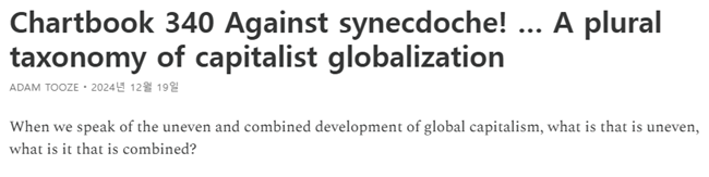 질문은 이것이다. 불균등 결합 발전의 형태를 어떻게 상상할 것인가? “금융화” 같은 축약적 표현(환유, synecdoche)을 넘어섰을 때, 우리는 세계경제를 어떻게 사유해야 하는가? 즉, 형태가 덜하고, 구조가 덜한 무언가를 어떻게 상상할 수 있을까?