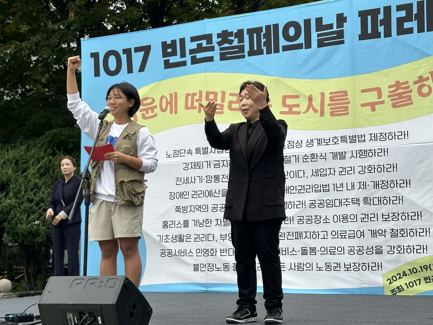 지난해 빈곤철폐의날 퍼레이드 현장. 재임 빈곤사회연대 활동가(왼쪽). 빈곤사회연대 제공