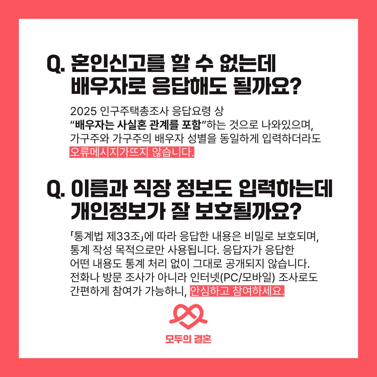 오는 22일 부터 다음달 18일까지 실시되는 ‘2025 인구주택총조사’에 참여하는 시민들은 성별이 같더라도 가구주와의 관계를 ‘배우자’ 또는 ‘비혼동거(함께 사는 연인 등)’로 응답할 수 있게 됐다. 지난 2020년 조사에서는 응답자와 가구주의 관계를 ‘배우자’로 선택하고 두 사람이 같은 성별이라 기재했을 때 ‘오류’ 메지가 노출되도록 시스템이 설계되어 있어 ‘동성 배우자’의 존재를 응답할 수 없는 구조였다.