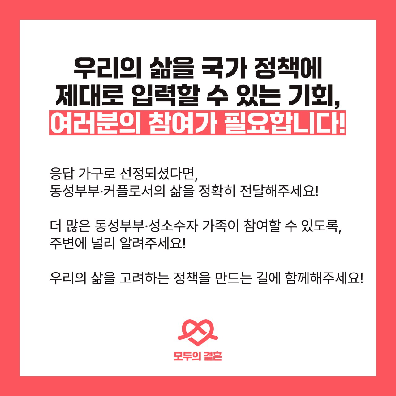 한편, 이 활동가는 “동성 부부, 성소수자 가족들이 자신들의 삶의 관계를 이번 조사에서 있는 그대로 기재할 수 있다는 사실을 알아야 정확하게 응답할 수 있을 텐데, 통계청이 이러한 변화를 적극적으로 홍보하지 않고 있다는 것이 가장 아쉬운 부분”이라고 지적하고, “이 사실이 더 널리 적극적으로 알려져 동성부부, 비혼 동거 커플 등 동성이든 이성이든 다양한 관계를 맺고 있는 이들이 얼마나 많이 살아가고 있는지가 국가의 기본 정책 자료에서 가시화 된다면, 이들의 삶을 보장하기 위한 동성혼 법제화나 생활동반자법 제정 등의 변화들을 더 적극적으로 정부가 추진 해야 한다는 근거를 사회적으로 확인할 수 있는 계기가 될 것이라고 생각한다”고 밝혔다.